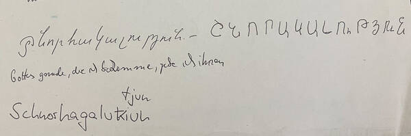 „Danke“ auf Armenisch wird in dieser Schrift so geschrieben: „Շնորհակալություն“. Gesprochen: „Shnorhakalut’yun“. Eine Kurzform davon gibt es nicht, da sagt man „Merci“.